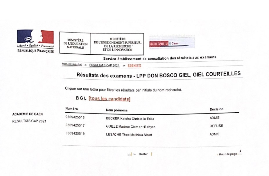 ← article précédentRésultats des candidats en deuxième année de CAP Espaces Verts article suivant →Résultats des candidats en BP Menuisier Articles associés Ne rater pas cet article Résultats du DNB en enseignement agricole12 juillet 2021-Posté par GielAdminLire plus →actualité giel1 Sortie à la la Roche d’Oëtre22 juin 2021-Posté par GielAdmin Mercredi 16 juin, pour marquer la fin de l’année et le début des révisions, Marine FOURET, Céline TROHEL, Sandrine et Denis … Lire plus →actualité giel1 Résultats du BTS des candidats en Etude et Réalisation d’Agencement6 juillet 2021-Posté par GielAdminLire plus →actualité giel1